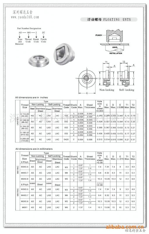 产品详情:浮动螺母,可调螺弹母,具备自动调节功用以补偿配合孔的安装误差,有着自锁和非自锁螺纹,螺纹尺码#4至1/4英寸,M3至M6。主要模型为:ASACLASLAC。基准有: