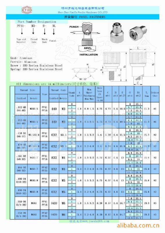 产品详情: 耀达五金厂长期大量提供以下标准:弹簧螺丝,松动螺丝(PF1PF2PF3PF4PF5PF6PF7PF50,PFZ2PF60,PFS50,PFS60,PF30,PFS30,PF31,PFS31,PF32,PFS32,PFC2P,PFC2,PFS2,PFC3,PFS3,PFC4,PFS4,PF091,PF21,PF22,PF08,PF09,PF10,PF41,PF42PF50,PF60,PF52,PF62,PF13,PF14,PFK-,PFHV,PS10,PR10,N34,HR,HE,p