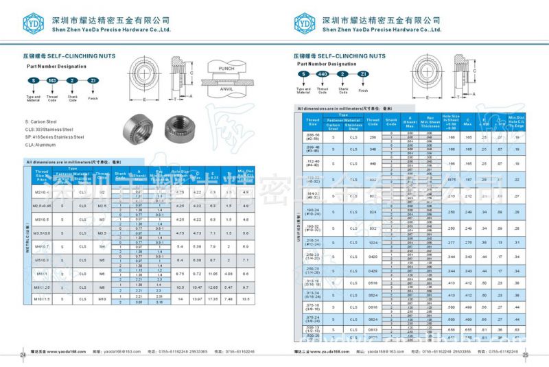 1.S系列压铆螺母使用易切削钢,热处理后开展表面处理。CLS系列压铆螺母使用易切削钢,不展开表面处理