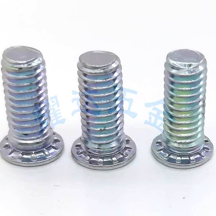 压铆螺钉的法则是一次被模具直接刺穿。它是一个扁平的圆形盖,下面是一个齿圈,然后是规范螺纹。它用到牙齿和金属板咬住以实现防松动。这样的目的,只要将其压在金属板上,就可以形成外螺纹,并且安装便利。压铆螺钉有圆头和六角头两种。外螺纹用以薄片。